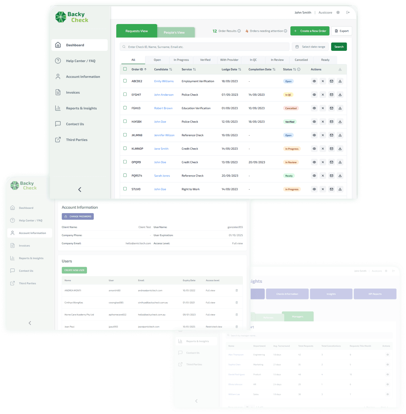 Backy Check’s online portal was built with the latest technologies making it reliable and secure. Our QA process minimises potential errors or risks during the application or processing.